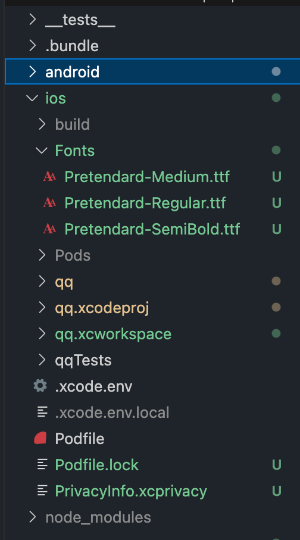- 아래 이미지와 같이 React-Native로 만든 프로젝트 안에 ios - Fonts 디렉토리에 사용하고자 하는 폰트 파일들을 넣어준다