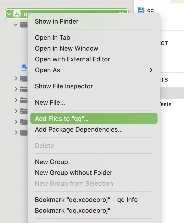 - 프로젝트 파일을 누르고 add Files to '프로젝트이름' 을 선택 후 자신의 프로젝트 - ios.- Fonts 폴더를 선택한다