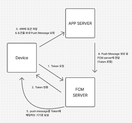 functions에서 문서가 트리거가 된 이후 getMesseging().send()를 통해서 message 객체를 token 값과 함께 FCM server로 보내고, FCM server에서 해당 토큰을 보고 토큰값에 해당하는 특정 기기로 message를 보내준다