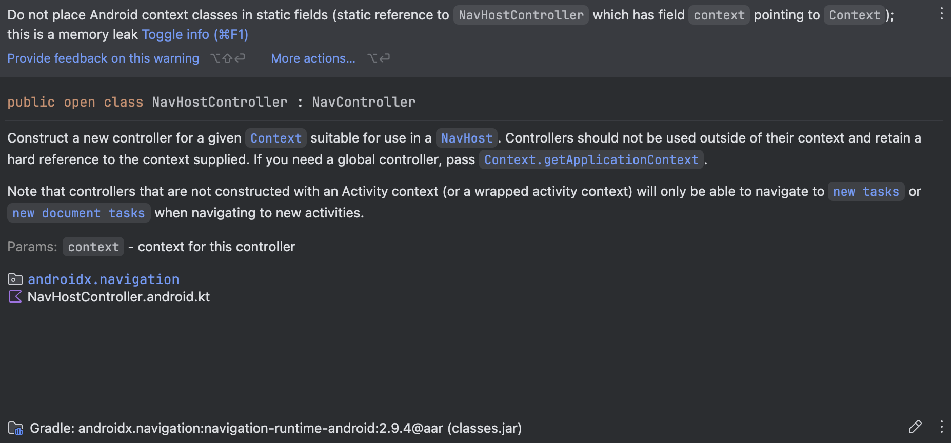 이 context 필드는 NavHostController에서 넘겨준 context(현재 Application의 context)를 참조하고 있는 거 같다(틀리다면 알려주세요...)쉽게 보자면 object NavigationManager의 변수 navController -> NavHostController -> NavController -> navContext -> context -> 현재 Application의 context(아마도 MainActivity) 이렇게 참조하는 관계가 만들어지는 것이다 참조하는 건 알겠는데 이게 무슨 문제냐고 할 수 있다 쉽게 말하자면 가비지 컬렉터가 계속 어디선가 참조되는 객체를 수거하지 않고, 이 때문에 수거되지 못한 객체가 메모리에 남아 메모리 누수를 일으킬 수 있다는 거였다 더보기가비지 컬렉터란? 더이상 참조되고 있지 않은 객체들을 알아서 정리해주는 기능 우리가 사용하는 객체들(ex: Activity, View 등) 혹은 직접 만든 클래스 등은 Heap 메모리에 있음 가비지 컬렉터는 참조되고 있지 않은 객체들을 Heap 메모리에서 알아서 자동으로 정리해주는 역할을 함 만약 앱을 종료한다고 쳐보자 compose의 remember가 종료되면서 rememberNavController가 정리된다 하지만 내가 만든 NavigationManager는 object이기 때문에 앱이 살아있는 동안 계속 존재하고 object NavigationManager는 계속 NavHostController를 참조하고 있고, 결국 MainActivity의 context를 계속 간접적으로 참조하고 있다고 볼 수 있다 만약 앱을 종료한다면 가비지 컬렉터가 MainActivity의 참조관계를 확인한 후, 참조하고 있는 곳이 있다면 가비지 컬렉트를 진행하지 않고(메모리에 계속 남아있음), 참조하고 있는 것이 없다면 가비지 컬렉팅을 한다(메모리 반환) 앱을 종료할 때 MainActivity를 참조하는 NavController가 삭제되어야하고 이를 삭제하려면 NavHostController가 삭제되어야 한다(NavController도 참조하고 있는게 없어야 삭제되기 때문에) 그런데 내가 만든 NavigationManager는 object로 선언되어있기 때문에 앱이 종료될 때까지 남아있다. NavHostController는 앱이 종료될 때까지 계속 메모리에 있기 때문에 참조 카운트가 0이 되지 못한다(계속 참조되고 있음). 따라서 가비지 컬렉터는 MainActivity를 메모리에서 수거하지 못한다 즉, MainActivity가 종료되었다고 해도 메모리에 계속 남아있기 때문에 메모리 누수가 발생하는 것이다